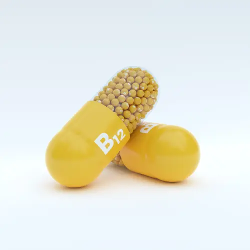 Vitamin B12 With Yellow Capsule, Granules and White Background