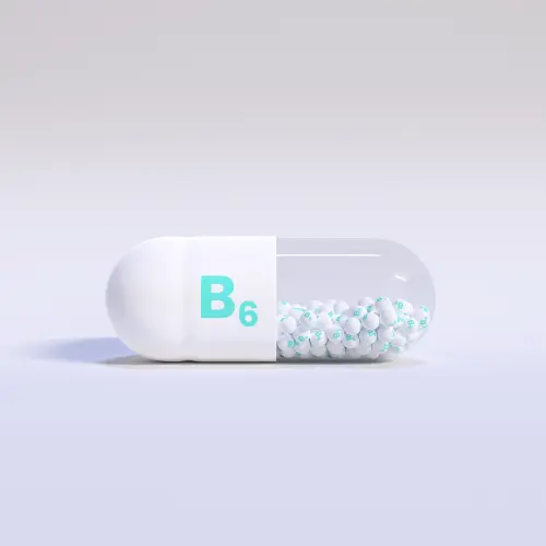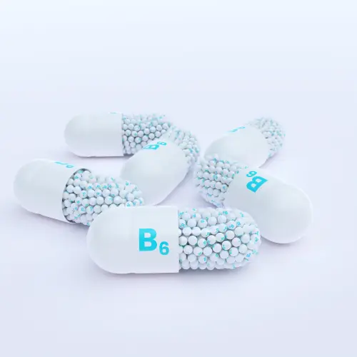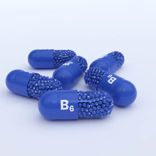 Vitamin B6 With Blue Capsule, Granules and White Background