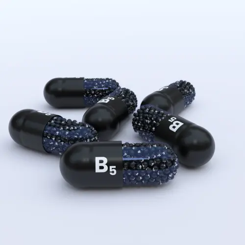 Vitamin B5 With Black Capsules, Granules and White Background