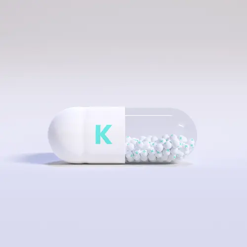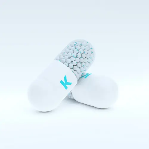 Vitamin K With White, Turqoise Capsule, Granules and Whtie Background