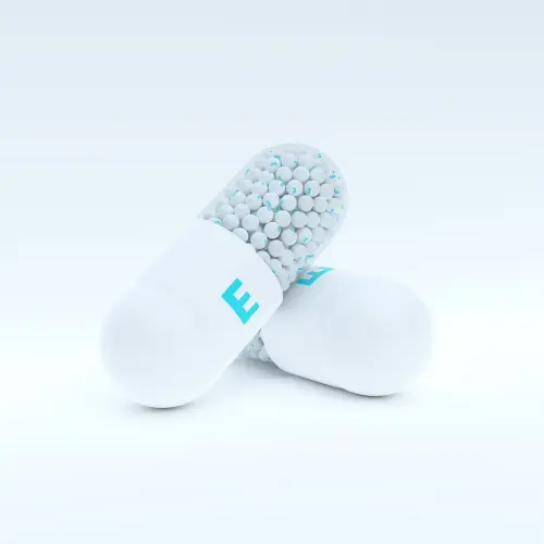 Vitamin E With White, Turqoise Capsule, Granules and Whtie Background