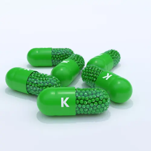 Vitamin K With Black Capsules, Granules and White Background