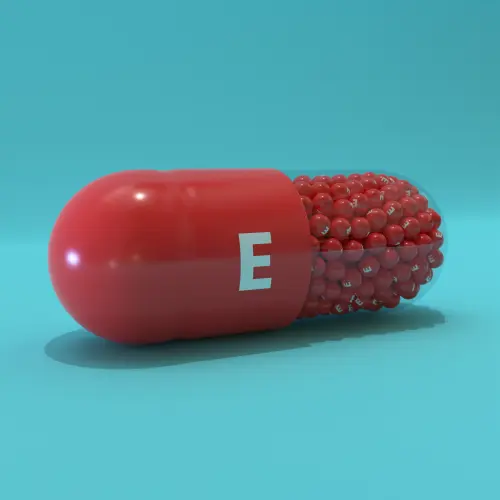 Vitamin E With Red Capsules, Granules and White Background
